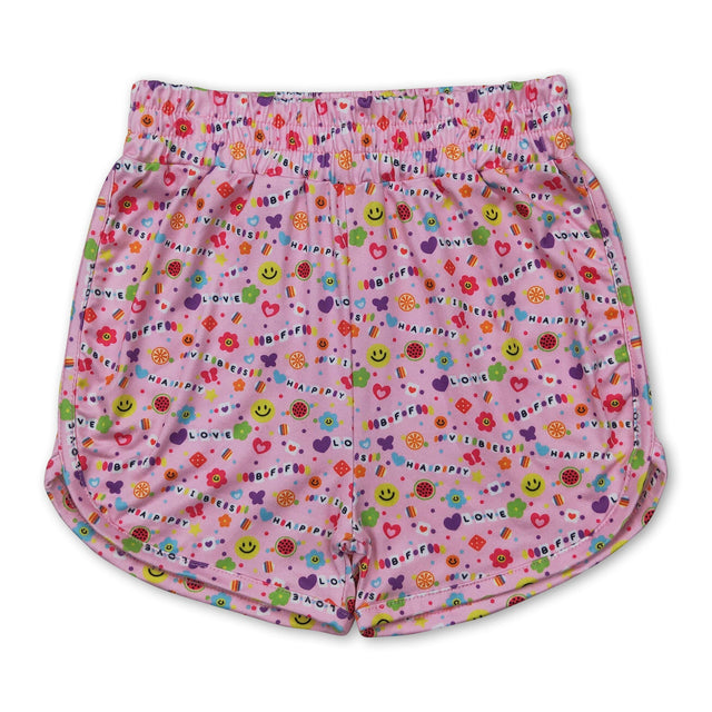 Pink happy vibes love floral baby girls summer shorts - 3-6M is backordered and will ship as soon as it is back in stock.