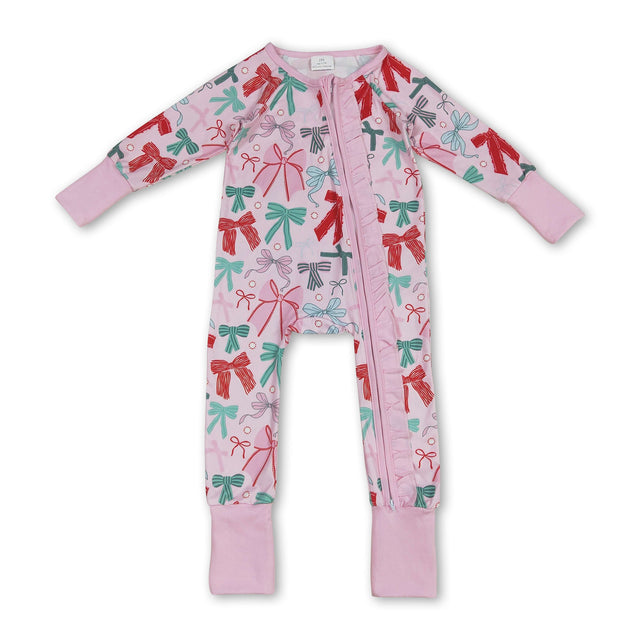 Pink long sleeves bows baby girls Christmas zip romper - 0-3M is backordered and will ship as soon as it is back in stock.
