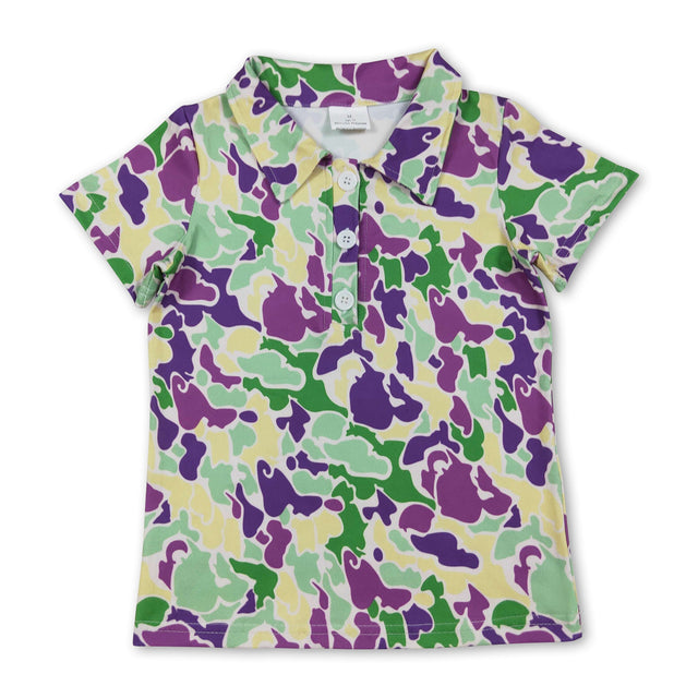 Purple green yellow camo kids boys mardi gras polo shirt