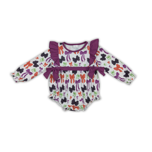 Purple orange black bows witches baby Halloween romper - 0-3M is backordered and will ship as soon as it is back in stock.