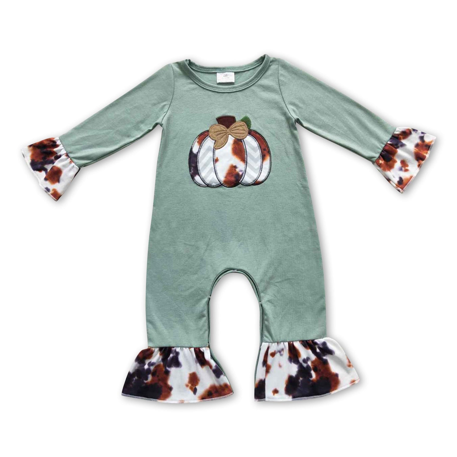 Cow print pumpkin ruffle baby girls fall romper - 0-3M is backordered and will ship as soon as it is back in stock.