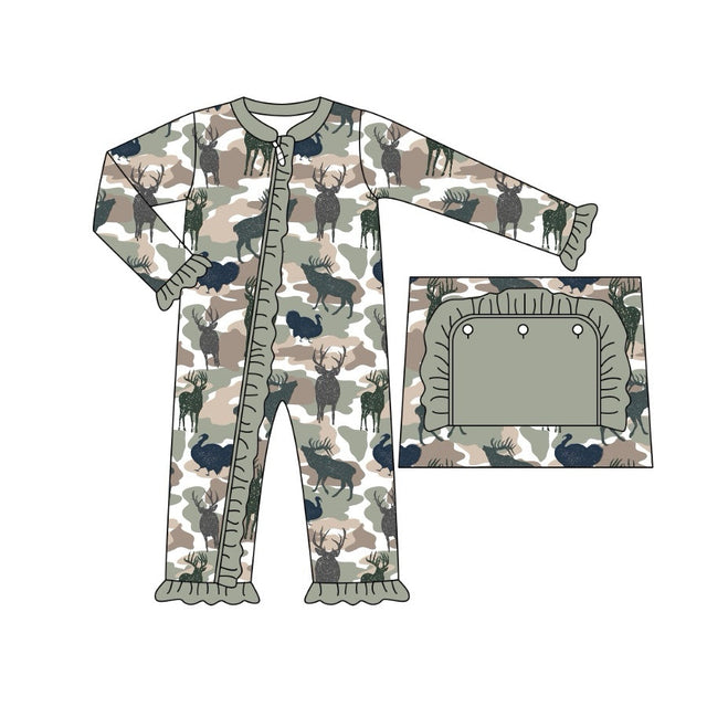 Deer turkey camo long sleeves baby girl zipper romper - 0-3M is backordered and will ship as soon as it is back in stock.