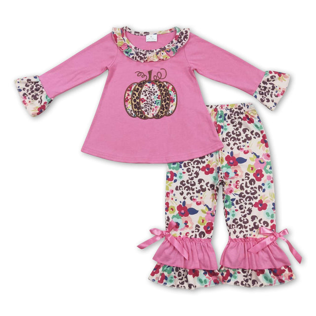 Floral leopard pumpkin top ruffle pants girls fall clothing