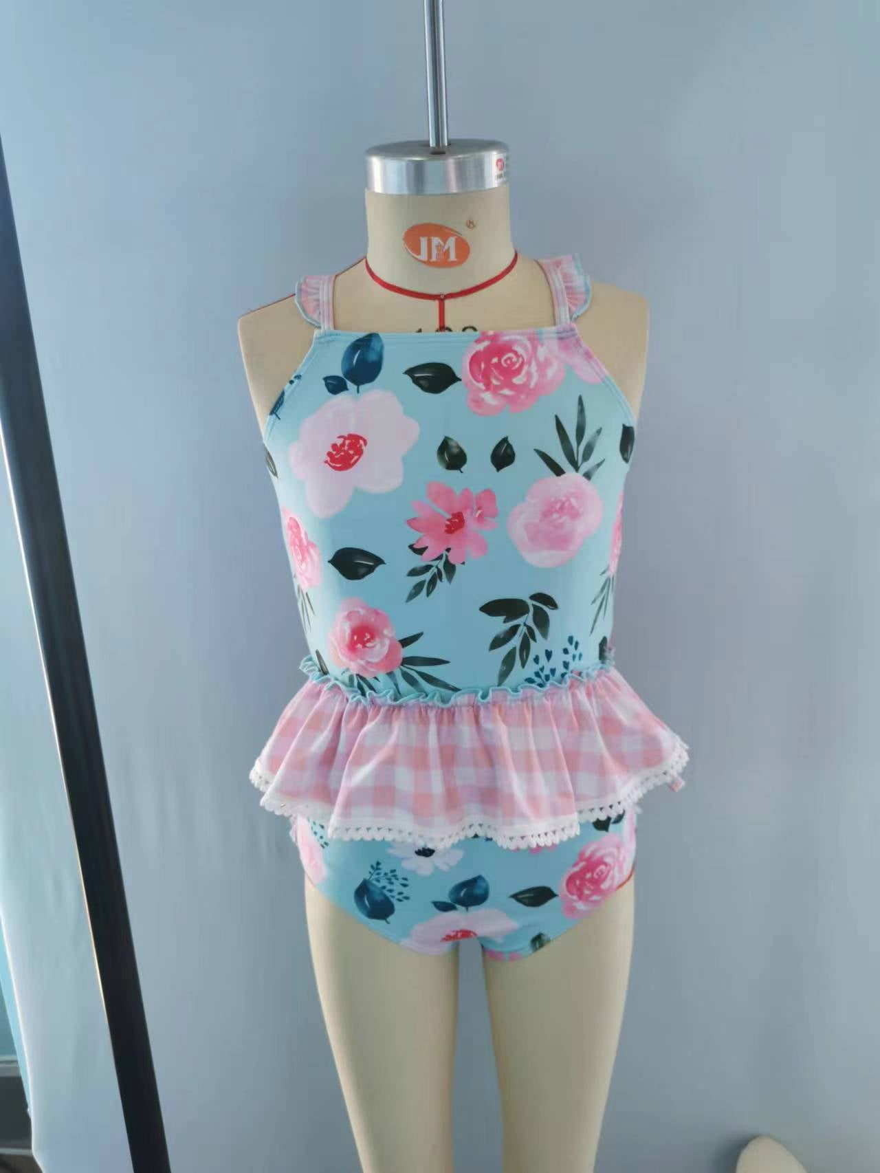 Floral pink plaid ruffle 2 pcs baby girls summer swimsuit