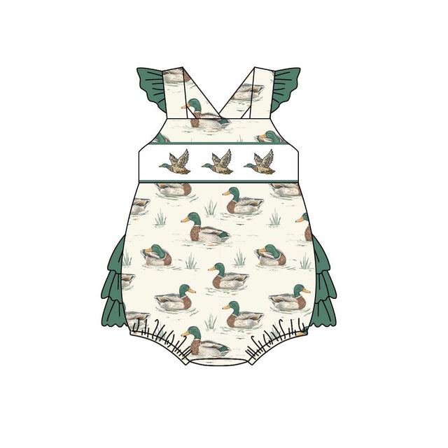 Flutter sleeves duck ruffle baby girls romper - 0-3M is backordered and will ship as soon as it is back in stock.