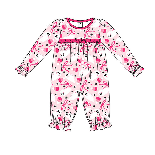 Hot pink ghost candy corn baby girls Halloween romper - 0-3M is backordered and will ship as soon as it is back in stock.