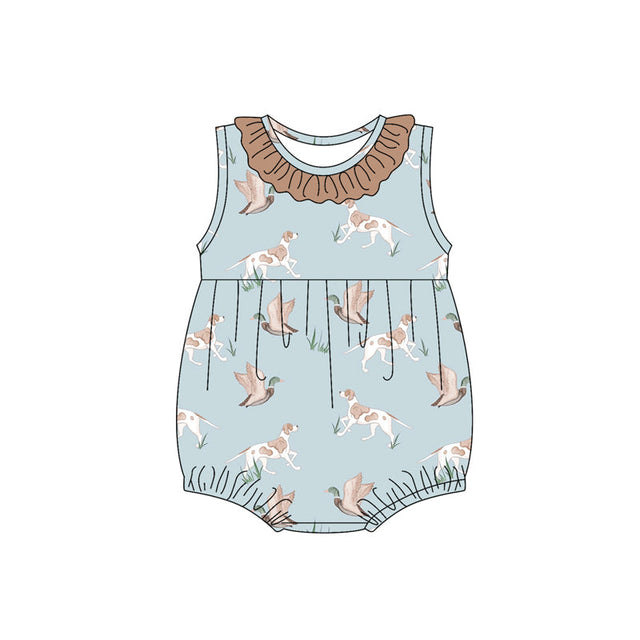 Khaki ruffle duck dog hunting baby girls romper - 0-3M is backordered and will ship as soon as it is back in stock.