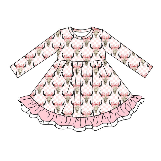 Long sleeves pink plaid bow cow girls ruffle dresses