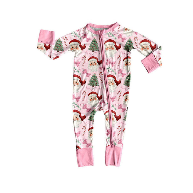 Pink bow candy cane santa baby girls Christmas zipper romper