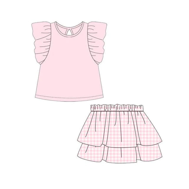 Pink flutter sleeves top plaid skirt girls clothing set