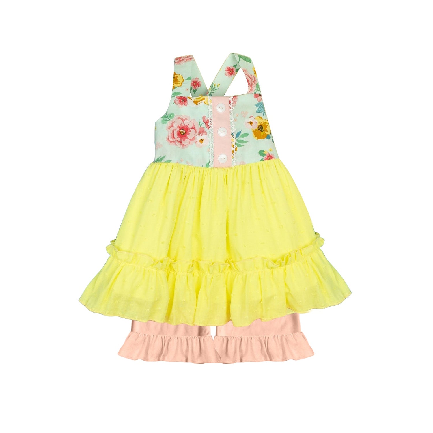 Straps yellow ruffle floral tunic shorts girls summer clothes