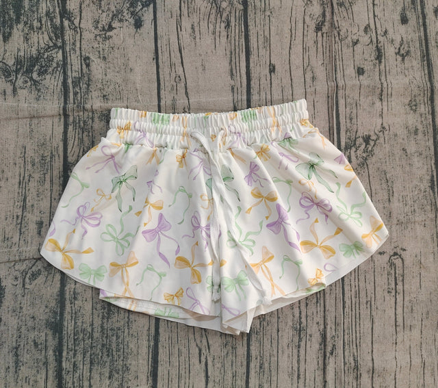 Purple green yellow bows kids girls Mardi Gras shorts - 3-6M is backordered and will ship as soon as it is back in stock.