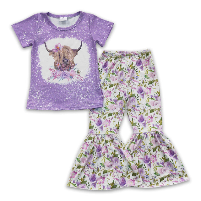 Highland cow shirt lavender floral pants girls spring clothes
