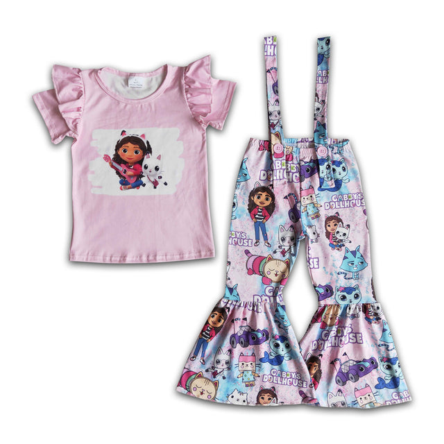 Short flutter sleeve shirt overalls cute cat kids girls clothing set