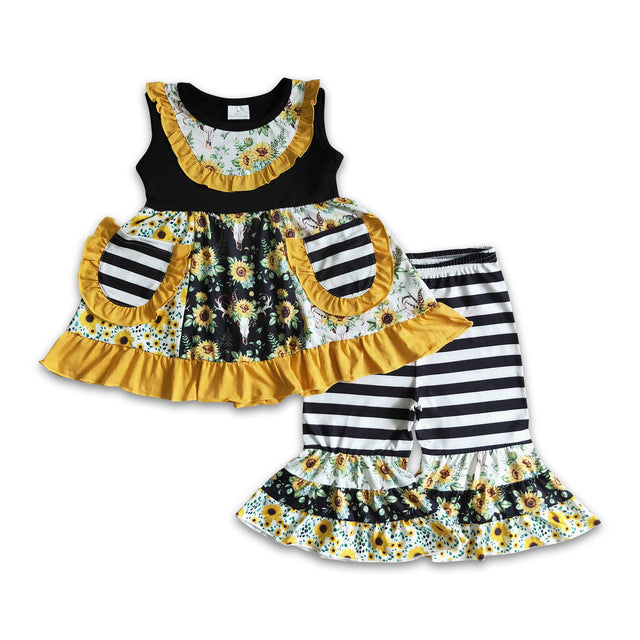 Skull sunflower patchwork pocket capris set girls clothes