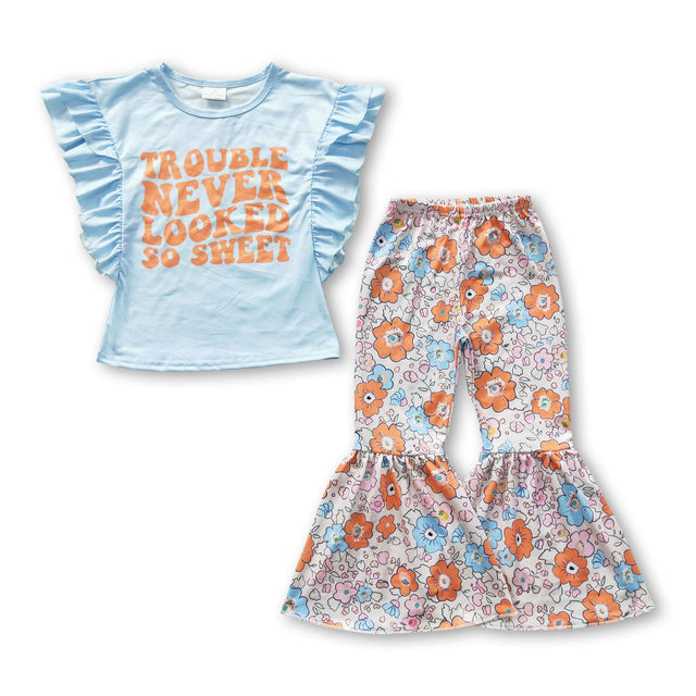 Trouble never looked so sweet shirt floral pants girls clothes - 3-6M is backordered and will ship as soon as it is back in stock.