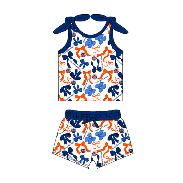 MOQ 3 pcs sleeveless blue orange bow top shorts girls team clothes