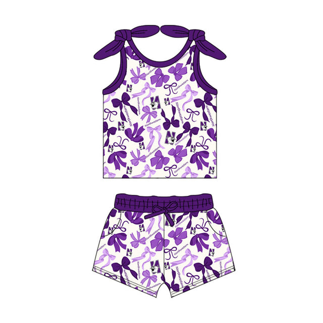 MOQ 3 pcs sleeveless N purple bow top shorts girls team clothes