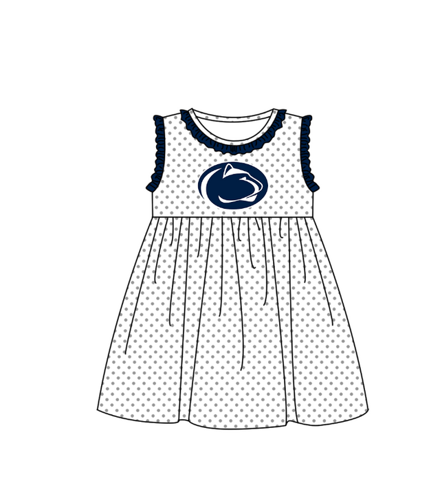 MOQ 5 pcs dark blue ruffle sleeveless white polka dots girls team dresses - 3-6M is backordered and will ship as soon as it is back in stock.