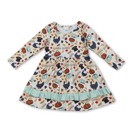 Long sleeves plaid turkey kids girls Thanksgiving dress