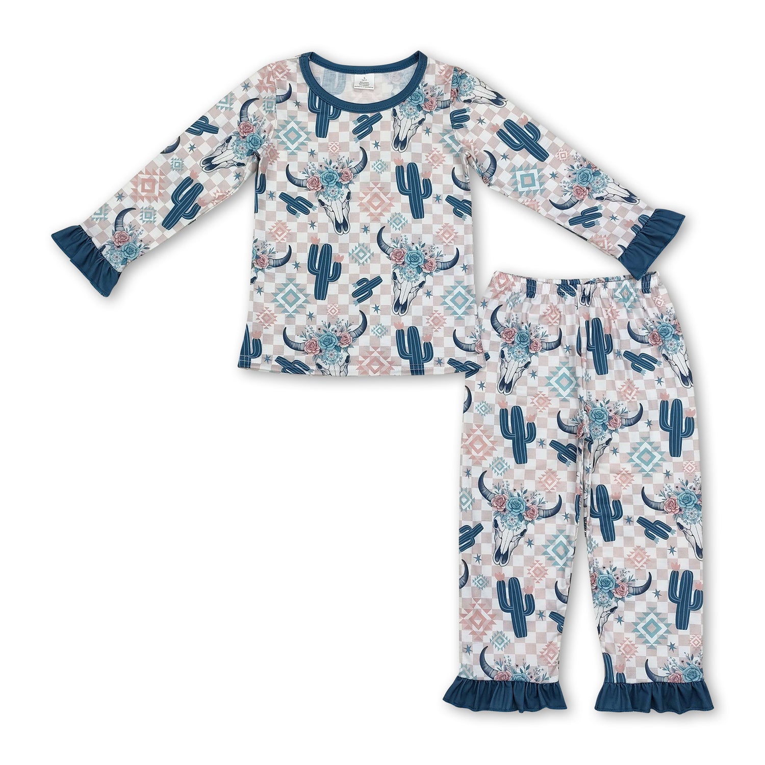 Long sleeves bull skull cactus plaid girls western pajamas - 3-6M is backordered and will ship as soon as it is back in stock.