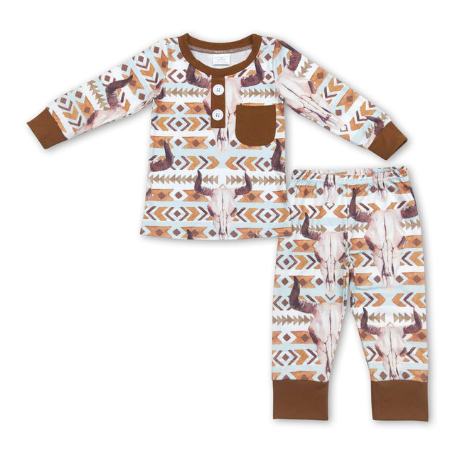 Brown pocket bull skull long sleeves kids boy western pajamas