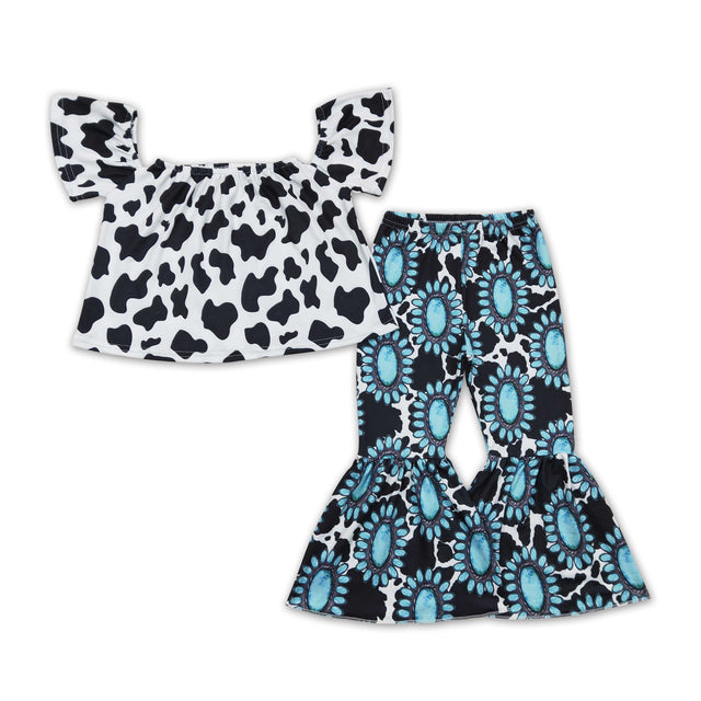 Cow top turquoise bell bottom pants girls western clothing set