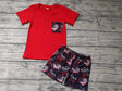MOQ 5 back the red pocket kids boy outfits - 3-6M is backordered and will ship as soon as it is back in stock.