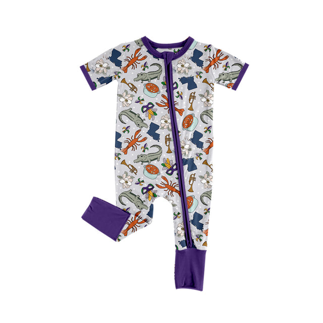 Purple alligator crawfish baby Mardi Gras zipper romper - 0-3M is backordered and will ship as soon as it is back in stock.