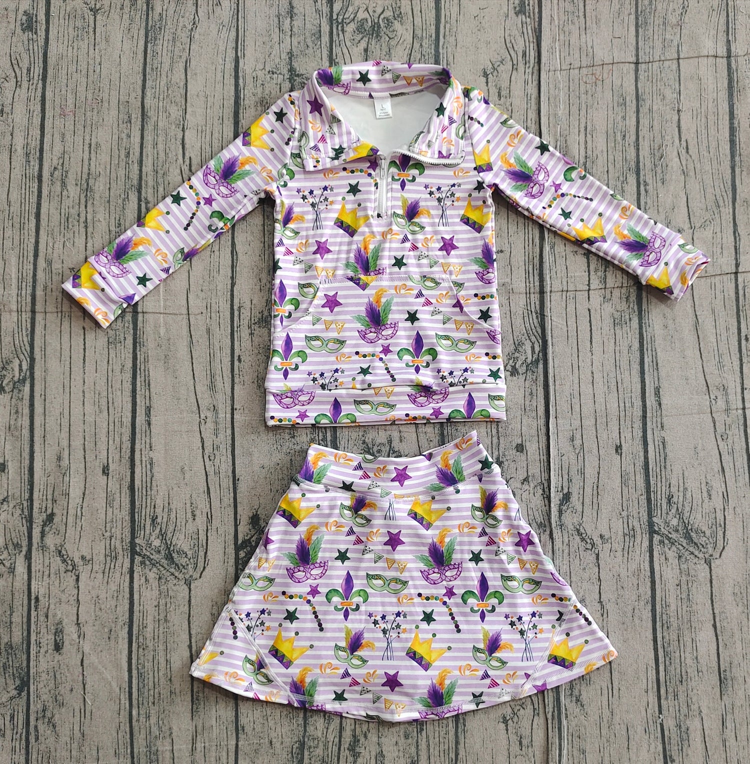 Purple stripe crown pullover skirt girls Mardi Gras active set
