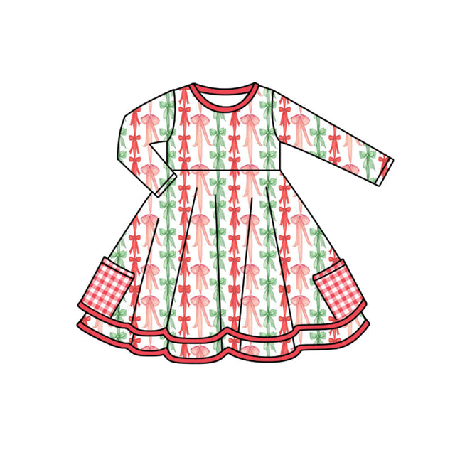 Red green bows plaid pockets ruffle girls Christmas dresses
