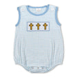 Sleeveless light blue plaid cross baby boy Easter romper - 0-3M is backordered and will ship as soon as it is back in stock.