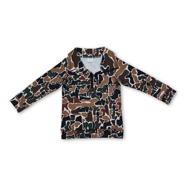 Long sleeves brown camo pocket kids zip pullover - 3-6M is backordered and will ship as soon as it is back in stock.