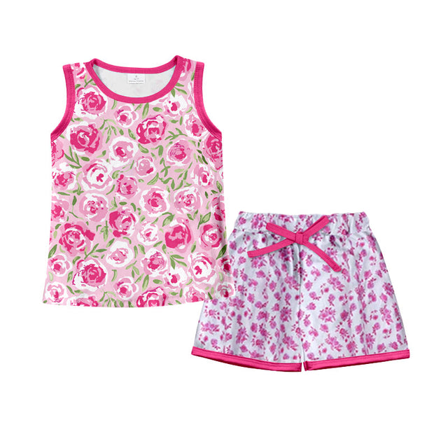 MOQ 3 pcs sleeveless pink floral top shorts kids girls outfits