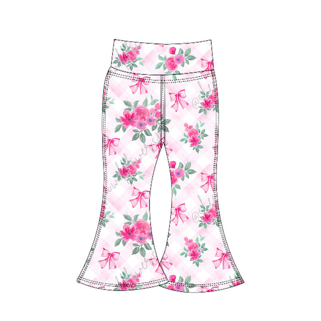 Plaid pink floral bow kids girls bell bottom yoga pants