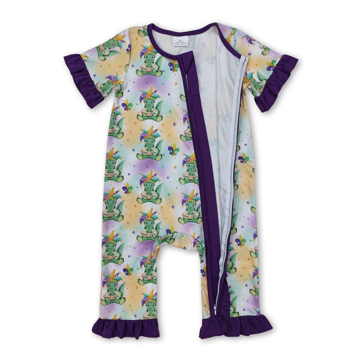 Purple short sleeves alligator baby girls Mardi Gras zip romper