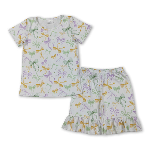 purple yellow green bows top bow girls mardi gras clothes - 3-6M is backordered and will ship as soon as it is back in stock.