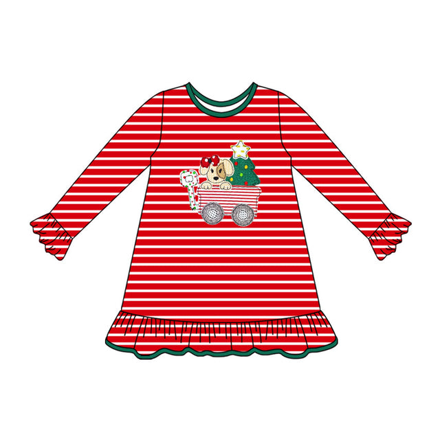 Red stripe dog Christmas tree ruffle girls dresses - 3-6M is backordered and will ship as soon as it is back in stock.