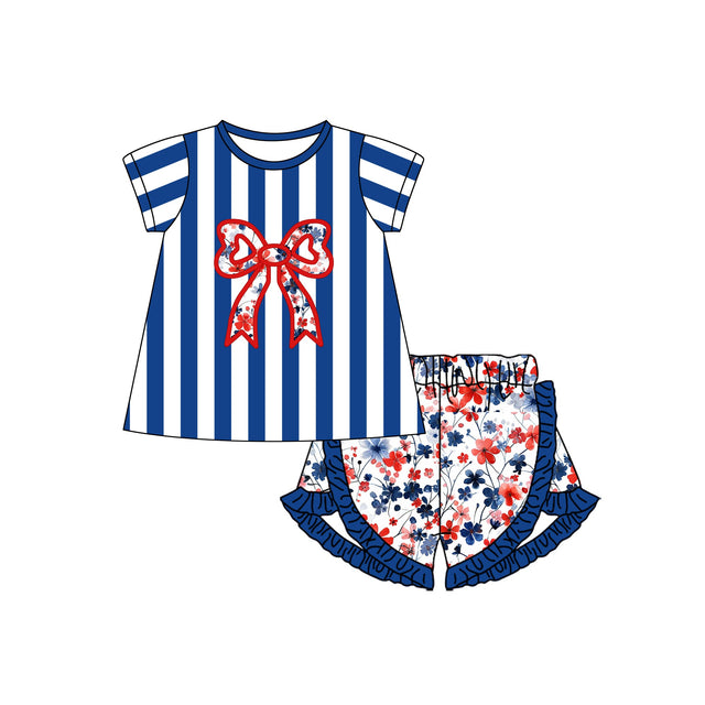 Short sleeves blue stripe floral bow top shorts girls clothes