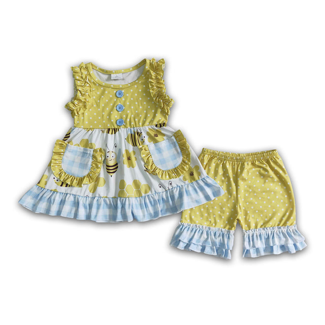 Sleeveless pockets bee print baby girls clothes